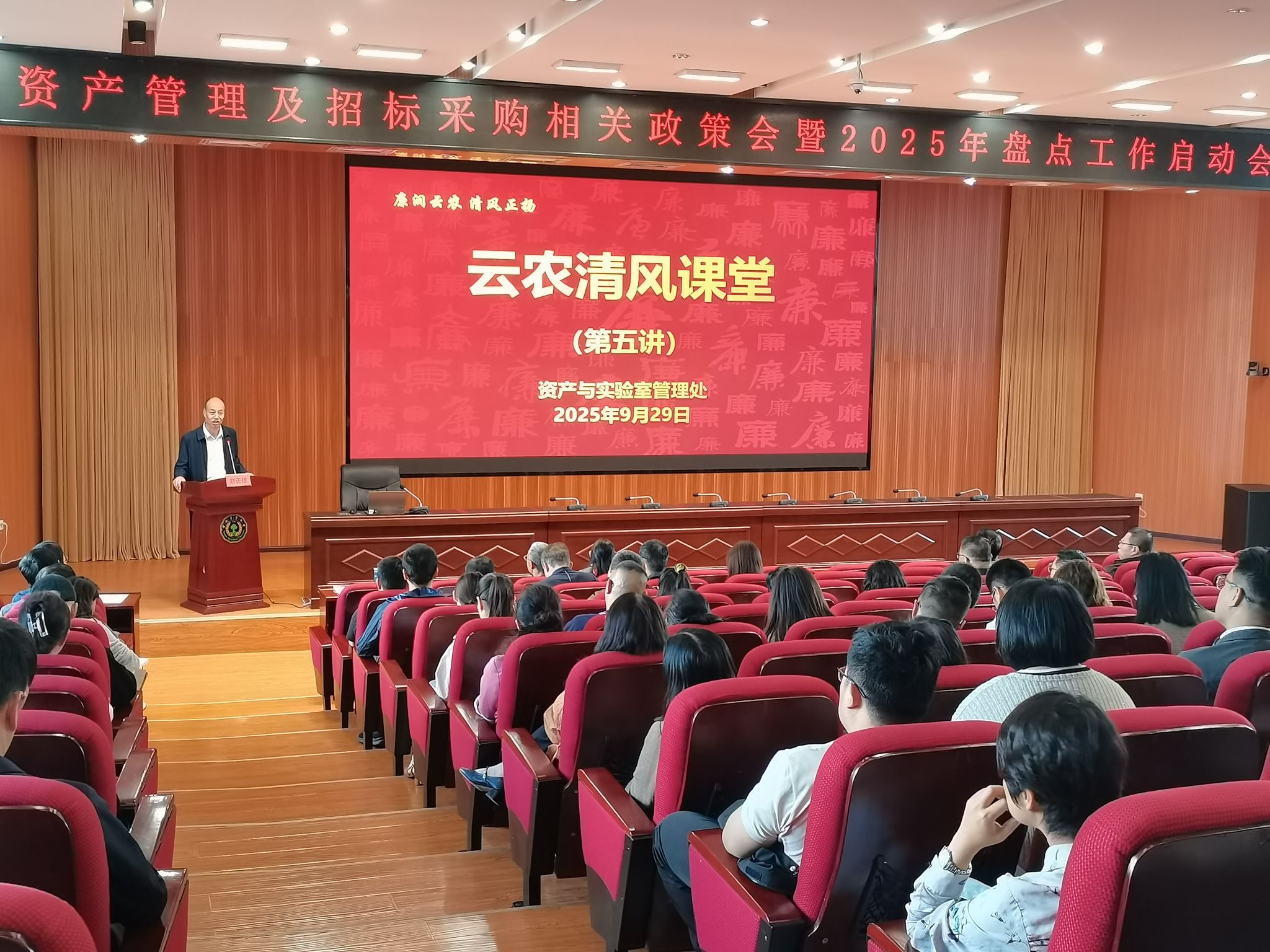 为纵深推进全面从严治党、筑牢廉政防线,扎实贯彻省委巡视整改资产管理领域两个专项整治工作要求,以实际行动推进“清廉学校”建设,进一步提升资产管理与招标采购规范化水平,强化风险意识,规避资产管理与招标采购领域重点环节的风险,9月29日,云南农业大学举行“云农清风课堂”资产管理及招标采购政策专题培训会暨2025年盘点工作启动会,会议由资产与实验室管理处李国治处长主持,分管校领导、各学院(部门)主要负责人、各学院(部门)分管固定资产领导、各学院(部门)资产管理员、实验室负责人及相关教职工参加,热作学院中层以上干部,通过网络会议参加培训。